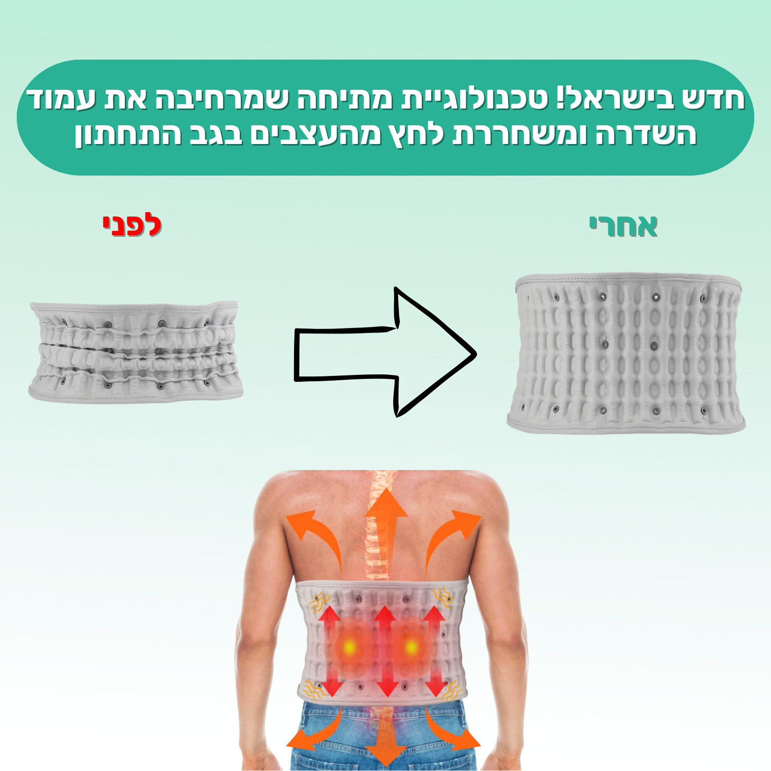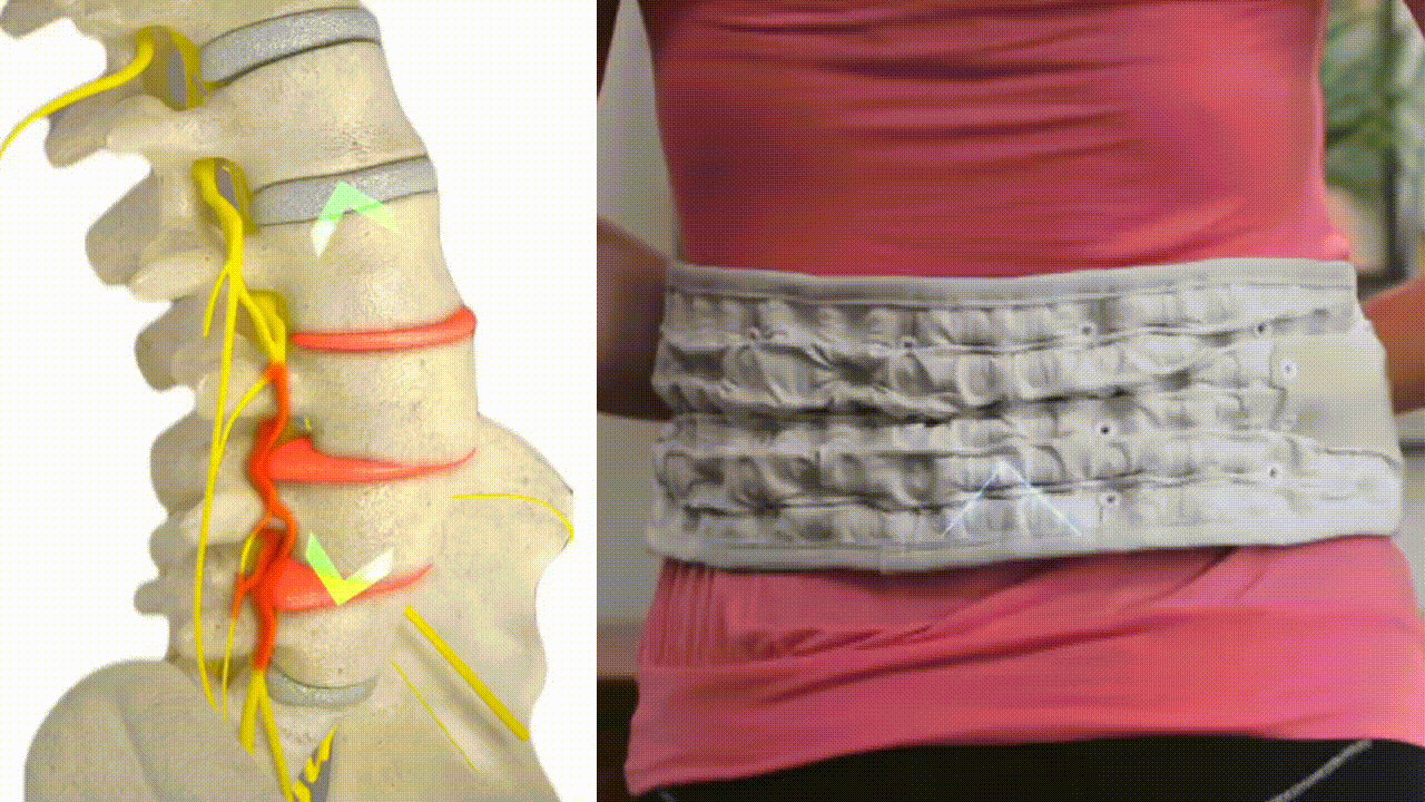 במהלך השימוש, החגורה מתנפחת בעדינות ויוצרת אפקט של דחיסה הפוכה שמפחית את הלחץ מהדיסקים ומהעצבים הלכודים.